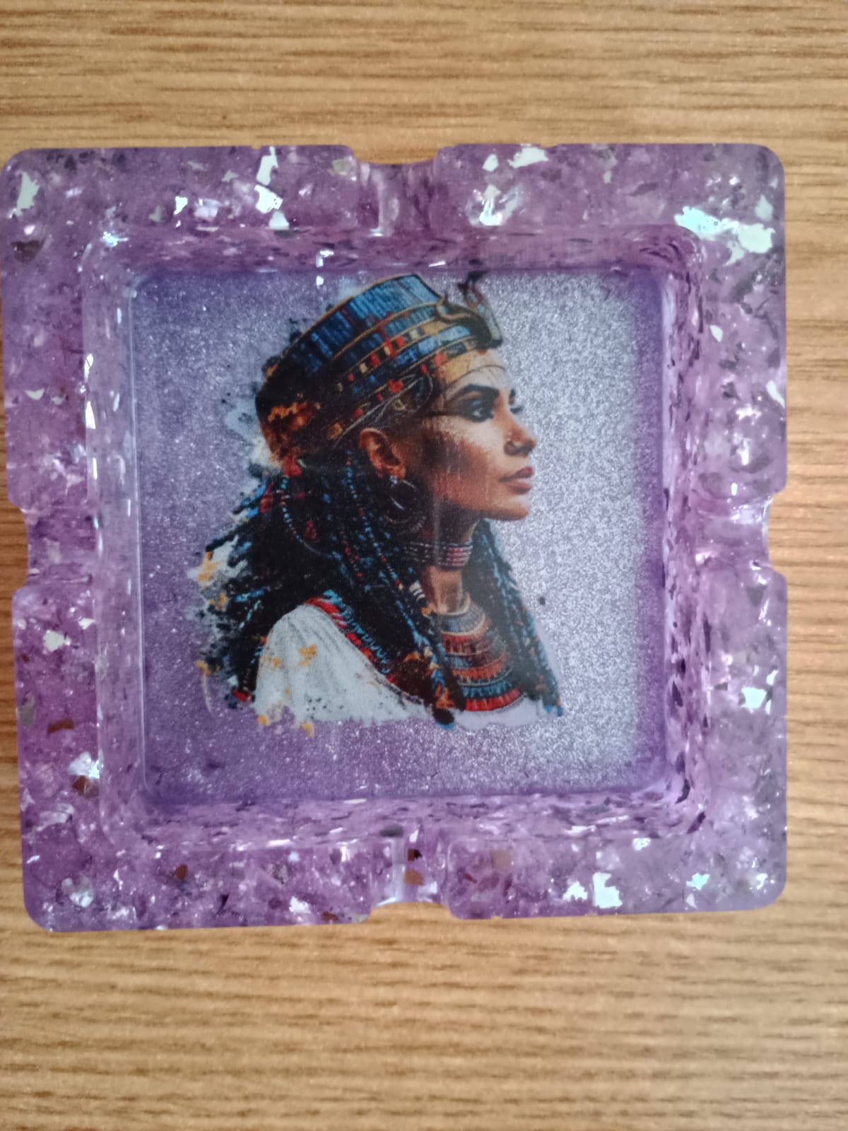 Transformă un obiect obișnuit într-o piesă de artă cu această scrumieră handmade din rășină, decorată cu portretul iconic al unei regine egiptene – inspirat de frumusețea și eleganța Cleopatrei. Realizată într-o nuanță vibrantă de mov cu inserții sidefate, această piesă este un mix perfect între funcționalitate și estetică.